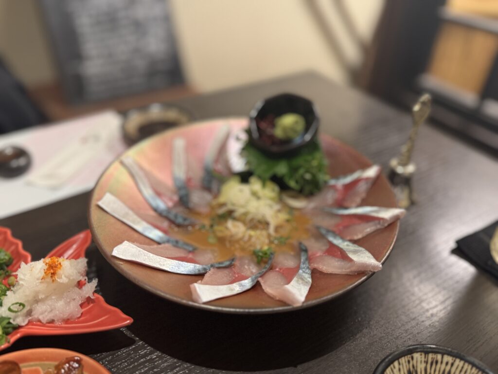The second photo features beautifully arranged sashimi. Fresh fish with shiny silver skin is carefully laid out in a circular design, with ginger, green onions, and sauce in the center. It’s not only delicious but also visually stunning—showing the chef’s attention to detail and respect for ingredients.