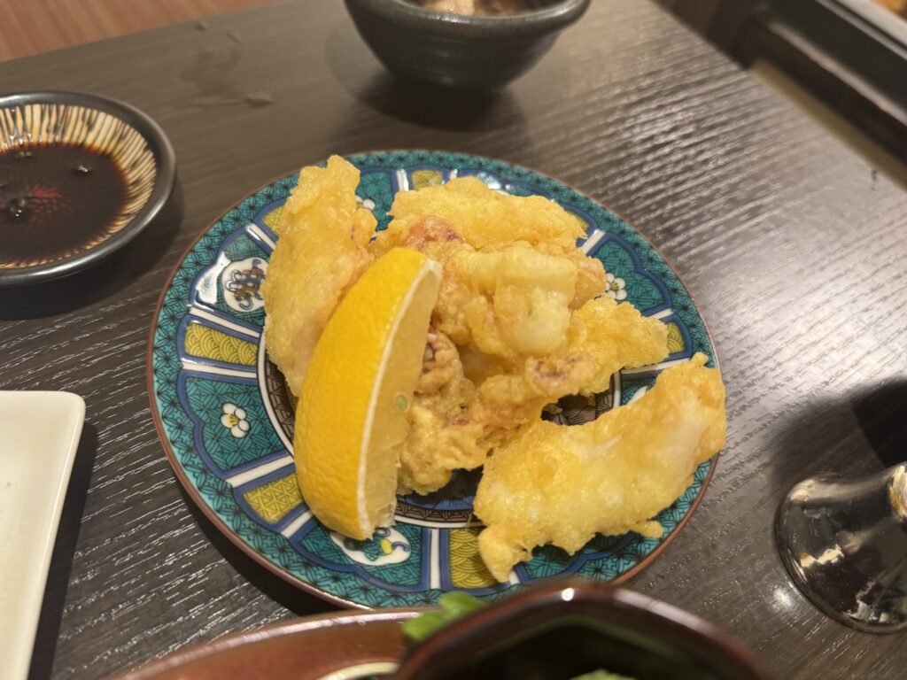 The first photo shows a plate of light, crispy fried food served with fresh lemon. The golden batter is thin and airy, keeping the inside juicy and tender. A squeeze of lemon adds a refreshing touch, making it a great match with beer or sake.